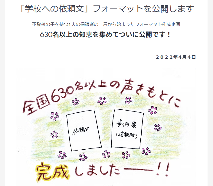 さいとう:学校に伝える内容が多いと、保護者さんの負担も大きいですよね。私の知り合いのNPOが、不登校の子どもの保護者さんや教員と協力して作成した「学校への依頼文フォーマット」があるんですが、迷ったらぜひそれを使ってほしいですね。